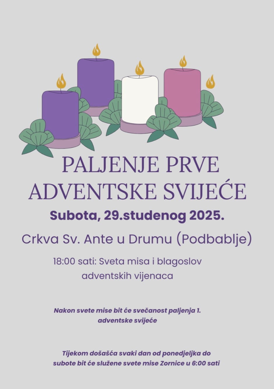 Inicijativom župnika fra Kristijana Perkovića, u župi Podbablje će se po prvi put održati svečanost paljenja prve adventske svijeće i blagoslov adventskih vijenaca. Svečanost će se održati u subotu, 29. studenoga 2025. godine, u 18:00 sati u crkvi Sv. Ante u Drumu.